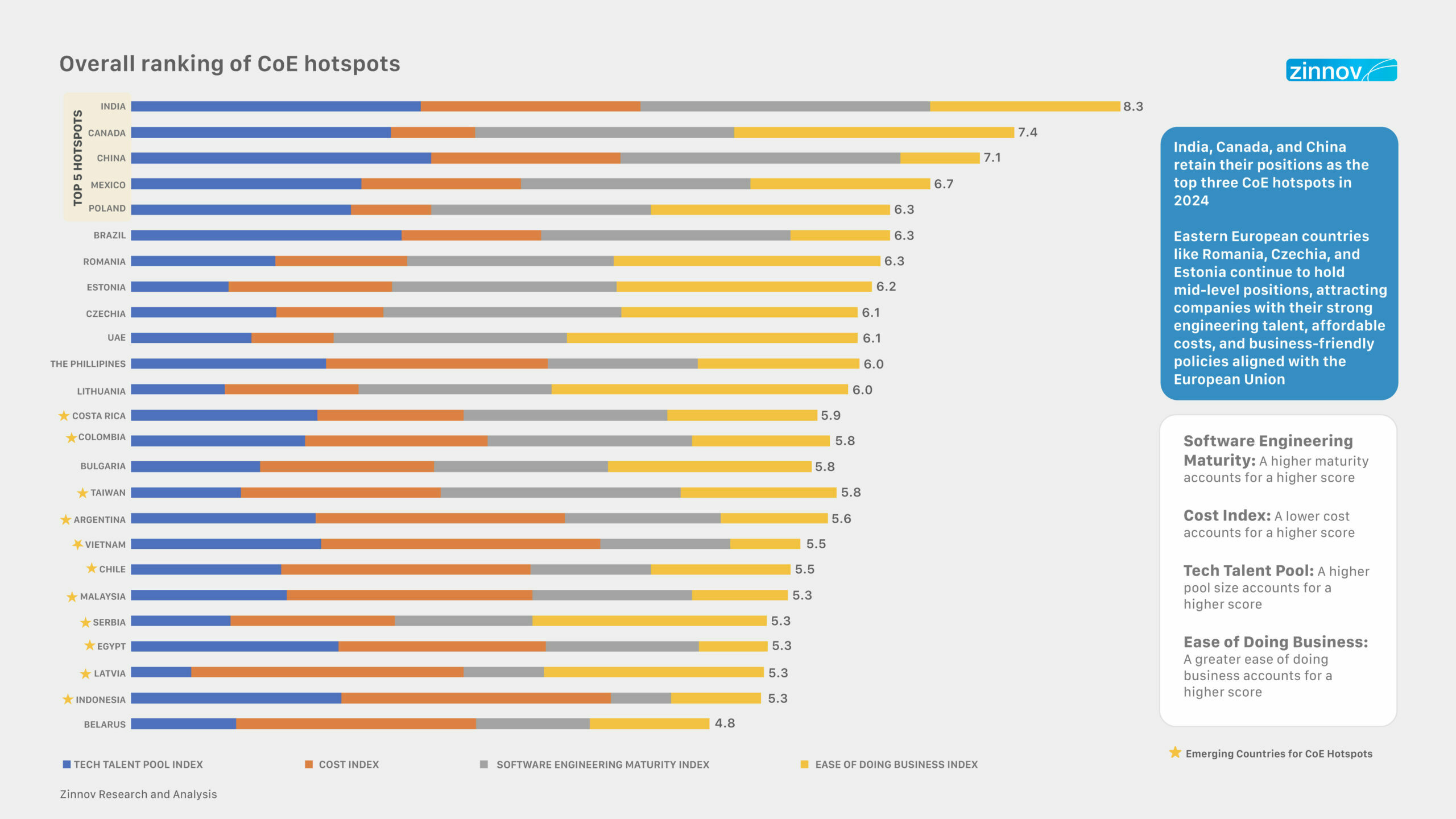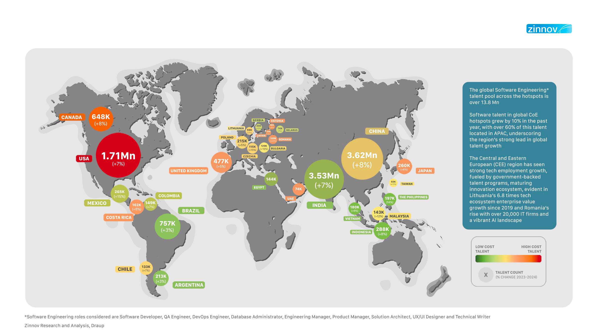 We have selected the 25 countries because of their high potential to house full software engineering teams. Zinnov’s extensive experience of working with global technology organizations, PE firms, and Technology Service Providers, uniquely positions us to evaluate key aspects such as the presence of significant talent pools, ecosystem maturity, affordable costs, and ease of doing business in terms of geopolitical stability, English proficiency, and IP and Data Privacy – that make certain countries global talent hotspots.